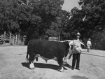 The Second Annual Auction Sale of the Central Texas Hereford Breeders' Association was held at Belton, Texas on November 1, attracted many persons interested in the livestock industry. Shown here are participant H. C. Jones of the firm of H. C. Jones & Sons, Marlin, Texas, with their herd bull, Prince Domino J 8th that was exhibited at the sale. Mr. Jones appears to be holding their herd bull from the halter rope.