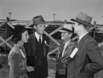 The Second Annual Auction Sale of the Central Texas Hereford Breeders' Association was held at Belton, Texas on November 1, attracted many persons interested in the livestock industry. Shown here are Hereford Breeders Association tour participant ranchers (left to right) Mr. and Mrs. David Bywaters, Hamilton, Texas; E. R. Lawrence County agent at Meridian, Texas and Hereford breeder Jack Cureton, Meridian, Texas. They appear to be having a conversation. The men are wearing suits and hats, Mrs. Bywaters is wearing a long sleeve dress and a hat. Published in the Fort Worth Star-Telegram morning edition, November 3, 1940.