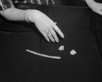 Jewelry plays more important part in the current fashion picture than it has before. Shown here are the models of gadget jewelry, real gems glittering in new and modern sets of unusual beauty. A model shows a handsome diamond bracelet on the arm and another on the black velvet, and a pair of diamond clip earrings which may be worn on a gown, on the hair or on a hat. The model is also wearing a diamond ring. Published in the Fort Worth Star-Telegram morning edition, November 3, 1940.