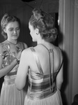 Jewelry plays more important part in the current fashion picture than it has before. Shown here are the models of gadget jewelry, real gems glittering in new and modern sets of unusual beauty. Emma Marie Arnold is wearing a French import, a long necklace with a large stone medallion on a long chain that drapes on her back. She is wearing the necklace like a chocker but it could be looped around the neck to make a double necklace. She is standing in front of a mirror holding on the medallion. Her gown has a silk layered top with a bow on one strap and the skirt is sheered and gathered at the waist. Published in the Fort Worth Star-Telegram morning edition, November 3, 1940.