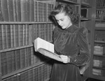 Miss Ethel Rae Cheatham, a junior at Texas Christian University (TCU), is shown as she delves into a history book in the Fort Worth Public Library research section in front of large shelves of books. Published Fort Worth Star-Telegram Morning Edition November 10, 1940.