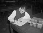 Fort Worth Public Library patron, Joe Collins gathers material for a theme for his English class at Paschal High School. He's seated at a library table, writing with pencil on paper, next to a stack of books. Published Fort Worth Star-Telegram Morning Edition November 10, 1940.