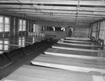 Shown here is the interior of one of the newly finished mess halls at Camp Bowie, Brownwood, Texas, where the Thirty-Sixth Division will train. The hall is filled with highly polished tables and at the far end of the building, people are working in the kitchen. Electricity is used for lightening. The building is gas-heated and kitchen has gas stoves. Published in the Star-Telegram evening edition, December 4 1940.
