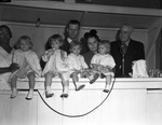 Galveston quadruplets near their second birthday. Quadruplets are shown as they appeared with their parents at the recent auction of the Jinkins Hereford Ranch near Normangee. The quads were in Normangee to visit Dr. W.J. Jinkins who welcomed them into this world nearly two years ago. Auctioneer Gartin (extreme right in the picture) introduced the girls and their parents to the crowd of cattlemen. The Badgett quadruplets are (left to right) Joan, Jeraldine, Joyce and Jeanette Badgett. Their mother and dad, Mr. and Mrs. W. E. Badgett, are standing behind them. Auctioneer Gartin is at extreme right. Published in Fort Worth Star-Telegram Morning Edition, November 28, 1940.