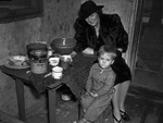 Civic and club leaders this year for the first time are seeing first hand the urgency behind the Goodfellows' annual appeal for contributions to give those in lesser circumstances a Christmas to remember for the other 364 days in the year. Mrs. Berta Womack, president of the Zonta Club, shown with a little 4 year old boy to be helped by the Goodfellows. They are both sitting at a small dining table in a house that is in poor condition. There are dirty dishes on the table. The child is wearing dirty, pin striped coveralls and has a sad expression on his face. He has his hands clasped together in his lap, as if anxious. Mrs. Womack is sitting behind him, looking at him and smiling. Mrs. Womack is dressed nicely, wearing a hat, fur stole, gloves, and a dark colored dress. Published Fort Worth Star-Telegram Evening Edition November 27, 1940.
