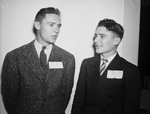 Methodist Student Conference attendees (left to right) John B. Wheeler, Texas Tech; and Courtney Siceloff, Southwestern University, Georgetown, Texas. They are in coat and tie and having a casual conversation in this half length portrait. They have their name tags on their coats. Published in the Fort Worth Star-Telegram evening edition, November 23, 1940.