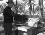 Frank Tisdale, Austin, Texas, tries out an outside, portable stove at Camp Wolters, Mineral Wells, Texas. He is wearing a hat, coat and trousers and holding a kettle over the stove. Beside the stove, on a table, is a box of cane syrup.