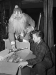 Joe Gerard, the "Santa" of the Santa Fe, started his annual gift giving trip from the Union Station by presenting Andrew J. Hill, 11, of Galveston his first present of the Yuletide trip that has been a feature of Gerard's work for the past 49 years. Young Hill was invited into the cab of Gerard's locomotive while waiting for the train to take him to Lawton, Oklahoma, where he will visit his aunt and uncle, Mr. and Mrs. Paul Walser. Mr. Gerard, dressed as Santa, is pulling a bugle out of a box while Mr. Hill sits beside him holding the box open. Published in the Fort Worth Star-Telegram evening edition, December 24, 1940.