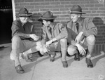 Three soldiers of headquarters company, third battalion, one hundred and forty-second Infantry, Abilene, are pictured here. They are, Left to right, Corporals. (Corps.) W. T. Holliday and C. G. Bullock, both of Abilene, Texas, and Private (Pvt.) D. G. Reyon of Hawley, Texas. All are wearing uniforms and hats. They are shown seated outside their home armory and enjoying a bull session while waiting for the soupy call. Published in the Fort Worth Star-Telegram morning edition, December 6, 1940.