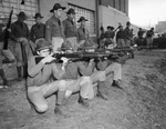 Four Men of Company A, One Hundred and Forty-second Infantry, Brownwood, are pictured here. They are from left to right, Privates (Pvts.) B. W. Wallis and J. B. Adams, Private First Class Al Carter and Corporal (Corp.) John J. Mahoney. The four soldiers are kneeling with their guns raised, waiting for the order to fire. Directing the firing practice is Sergeant (Sergt.) William H. Pruitt, standing directly behind them. A number of other soldiers are standing behind them, everyone is wearing uniforms and hats. Published in the Fort Worth Star-Telegram morning edition, December 6, 1940.