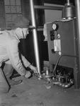 First Lieutenant Hank Clewis is shown using a wrench on a machine in the kitchen of the mess hall. He is wearing his military uniform and hat. Lieutenant Clewis, of the Service Company, was an athlete at the University of Texas from 1930-32. Published in the Fort Worth Star-Telegram morning edition, December 12, 1940.