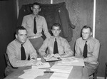 Four Army officers are pictured here. The Second Battalion Staff manages to keep busy at its Lubbock headquarters. Left to right, are: Colonel (Col.) Harold H. Griffith, commander; Major (Maj.) C. J. Davis, executive officer; Captain (Capt.) Henry P. Widmer and First Lieutenant (Lieut.) A. L. Fitzsimmons. All are dressed in uniforms. Published in the Fort Worth Star-Telegram evening edition, December 13, 1940.
