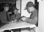 Army Corporal (Corp.) Robert W. Shield prepares for Military Police (M. P.) duty with Company G at Snyder, Texas. He is receiving his pistol from Private (Pvt.) Jesse D. Bunch, center. Second Lieutenant (Lieut.) Homer M. Spence is shown on the left, marking notes on a piece of paper. All are wearing uniforms and hats. Published in the Fort Worth Star-Telegram evening edition, December 13, 1940.