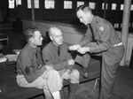 Some Army members of the Headquarters Battery of the One Hundred Thirty-first Field Artillery of Wichita Falls, Texas, are shown here. First Lieutenant (Lieut.) Marvin M. Rudd, is standing and reading a telegram from First Battalion Headquarters at Plainview, Texas. First Sergeant (Sergt.) Loyd P. Glidewell, left, and Staff Sergeant (Sergt.) Robert L. Dodd, center, sitting on a cot and listening to Lieutenant (Lieut.) Rudd. All three men are wearing uniforms. Published in the Fort Worth Star-Telegram morning edition, December 8, 1940.