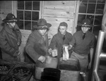 United States Army Thirty-sixth Division moves to Brownwood, Texas. Privates (Pvts.) Harold Chapman and Private Bedford Terry, both of Floydada, Texas, get some hot coffee after their arrival at the new Brownwood camp. Mixing more coffee is Head Cook William T. Engle of Lampasas, Texas. There is one unidentified member. All the men are wearing uniforms, jackets, and hats. Published in the Fort Worth Star-Telegram evening edition, December 12 1940.