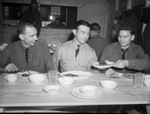 Thirty-sixth Division moves to Brownwood camp, Texas. Shown here are, left to right, Privates (Pvts.) H. W. Van Atta, Fort Worth, Texas; Roy McDowell, Handley, Texas, and Martin Engquisty, Fort Worth, Texas. The men are sitting at a table with plates of food in front of them. Private (Pvt.) Engquisty is handing a plate of food to Private (Pvt.) McDowell. They are enjoying food. Published in the Fort Worth Star-Telegram evening edition, December 12, 1940.