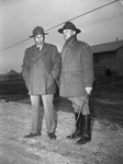 Army troops are destined for a year's training at Camp Bowie, Brownwood, Texas. Soldiers of the One Hundred Eleventh Quartermaster Regiment were the first arrivals. Army Lieutenant Colonel (Lieut. Col.) C. C. Ingram, left, and Major (Maj.) Carl S. Phinney are pictured here. Both officers are wearing uniforms, jackets, and hats. They are standing on a gravel path and gazing at the truck convoy. Colonel (Col.) Ingram is in charge of the motorcade and Major (Maj.) Phinney is motor maintenance officer of the division. Published in the Fort Worth Star-Telegram morning edition, December 12 1940.