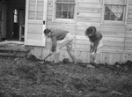 Army troops are destined for a year's training at Camp Bowie, Brownwood, Texas. Soldiers of the One Hundred Eleventh Quartermaster Regiment were the first arrivals. Shoveling mud away from in front of the mess hall are Army Privates (Pvts.) P. L. Manis, left, and Leonard James. Both men are wearing uniforms and hats. Published in the Fort Worth Star-Telegram morning edition, December 12, 1940.