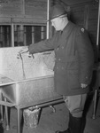 Army troops are destined for a year's training at Camp Bowie, Brownwood, Texas. Soldiers of the One Hundred Eleventh Quartermaster Regiment were the first arrivals. Army Captain J. W. Mohrmann of Gonzales, Texas, commanding officer of the service company is pictured here. He is testing the mess hall sink by turning on one of the faucets. Captain Mohrmann is wearing uniform jacket, and hat. Published in the Fort Worth Star-Telegram morning edition, December 12, 1940.