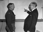Army Major R. E. Froiseth and Contractor Taylor in Abilene, Texas are shown standing in front of a wall that has blueprints taped to it. Major Froiseth is wearing a uniform. Mr. Taylor is wearing a suit and tie and pointing an area on the blueprints. Published in the Fort Worth Star-Telegram morning edition, December 22, 1940.