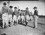 Army Major General (Maj. Gen.) Claude V. (C. V.) Birkhead, commanding officer of the Thirty-sixth division, is shown standing behind a line of enlisted men and listening attentively while a company of the One Hundred Eleventh Medical Regiment received instructions at a field drill. Standing behind him is Major (Maj.) C. B. Brewster of the headquarters staff of the Medical Regiment. The group standing the informal inspection are members of the ambulance company, and they are learning how to care for wounded men on the battle field. Everyone in this picture are wearing uniforms and hats. All are standing in a field. Published in the Fort Wroth Star-Telegram morning edition, December 10, 1940.