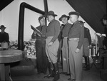 Major General (Maj. Gen.) Claude V. Birkhead of San Antonio, commanding officer of the Thirty-sixth Division is inspecting the kitchen of Service Company, One Hundred Forty-fourth Infantry. Army Mess Sergeant (Sergt.) Sam R. Jarrell showing menu to the Major General (Maj. Gen.). Back of the General is Lieutenant Colonel (Lieut. Col.) Gaston Howard of the headquarters staff, One Hundred Forty-Fourth Infantry. In the foreground is Capt. K. W. Brockman, commanding officer of the Service Company. All members are dressed in uniforms and standing under an open structure. Published in the Fort Worth Star-Telegram morning edition, December 10, 1940.