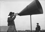 Army Private (Pvt.) First Class Orin Phelps, bugler of regimental Headquarters Company, One Hundred Forty-fourth Infantry, shown here blowing a bugle into a megaphone. He is dressed in uniform and announcing to his fellow soldiers that the army is serving dinner on the drill ground at Main Street and East Lancaster Avenue. Published in the Fort Worth Star-Telegram morning edition, December 8, 1940.