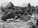 Shown here are, left to right James F. Shamburger, Earl M. Tracy, Charles C. Johnson and W. C. Scribner. They are sitting at a table with a "Corporals Only" sign on it and enjoying their meal. All are wearing uniforms and hats. Published in the Fort Worth Star-Telegram morning edition, December 8, 1940.