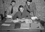 Army Second Lieutenant (Lieut.) Everett W. Moss, left, Corporal (Corp.) Creighton Romine seated at the table and Private (Pvt.) Billie Yantis are pictured here. Lieutenant (Lieut.) Moss is helping Corporal (Corp.) Romine scan the enlistment sheet for Battery D, Second Battalion, One Hundred Thirty-first Field Artillery at Wichita Falls. Corporal (Corp.) Romine is holding a pen and writing on papers and Private (Pvt.) Yantis is looking on the papers. All are dressed in uniforms. Published in the Fort Worth Star-Telegram morning edition, December 8, 1940.