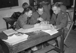 Shown here are, left to right, Army First Lieutenant (Lieut.) James G. Barnett, Second Lieutenant (Lieut.) Fletcher P. Davis and Second Lieutenant (Lieut.) Clifford J. Clyburn. All are officers of Company E, Sweetwater, Texas. They are checking the company's contemplated motor movement to Camp Bowie. The men are wearing uniforms and are in a room, sitting at a table covered in papers. Behind them are some other men doing various work. Published in the Fort Worth Star-Telegram evening edition, December 14, 1940.