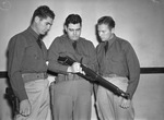 Army Second Lieutenant E. S. Simpson, center, demonstrating the Model 1903 rifle to Sergeant (Sergt.) Carl Matney, left, and Private (Pvt.) Lee Gordon, right, at Canyon, Texas. The men are all wearing uniforms and ties and are standing against a wall. Sergeant (Sergt.) Matney is a former footballer at West Texas State Teachers College. Published in the Fort Worth Star-Telegram evening edition, December 14, 1940.