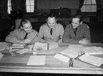 Three Army officers of the Headquarters Battery, First Battalion, One Hundred and Thirty-first Artillery, Abilene, Texas, are pictured here. They are, from left to right, Second Lieutenant (Lieut.) V. P. Hines, Captain (Capt.) Frank J. Hahns and Second Lieutenant (Lieut.) R. W. Elliott. They are shown seated at a desk and looking some papers to check over the day's schedule for the battery. All are wearing uniforms. Published in the Fort Worth Star-Telegram morning edition, December 4, 1940.