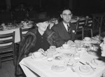 West Central Texas Oil and Gas Association ninth annual convention attendees include Alton Remington, scout for Pure Oil Company of Abilene, Texas and his wife. Mrs. Remington is wearing a fur coat and hat while Mr. Remington is wearing a suit, tie, and glasses. They are sitting at the dinner table at the closing the session. Published in the Fort Worth Star-Telegram morning edition, December 8, 1940.
