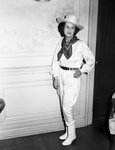 Mrs. Carter in cowgirl attire. Mrs. Carter is standing in front of the wall and his posed sideways with her left hand on her hips and her right hand down to the side . She is wearing an outfit that consists of a silk shirt, pant, hat, neckerchief and boots.