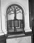 Copies of the Texas Declaration of Independence in a rotating in a cage like frame. The frame is topped with a leafing tree made of metal as well. Published in the Fort Worth Star-Telegram.