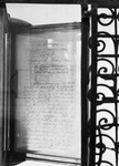 Close up of a page of the Texas Declaration of Independence. A section of the dark metalwork surrounding the copy can also be seen. Published in the Fort Worth Star-Telegram.