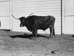 Single dark long-haired Longhorn steers is standing in profile, head turned towards camera, at Shady Oak Farm. In the background is a light colored exterior wall and doors of a barn. Published in the Fort Worth Star-Telegram.
