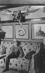 Amon G. Carter, Sr. seated on couch. A portrait of Amon G. Carter, Jr. is seen hanging on the wall at right.