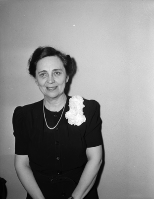 The Texas State Democratic Convention is getting under way in Mineral Wells, Texas. Mrs. H. H. Weinert of Seguin, Texas, is prominently mentioned for the newly-created post of vice chairman of the State Democratic Executive Committee. Tarrant County, Texas voted to pledge her. She is standing against a wall, wearing a button-up dress, pearl necklace, and a corsage.