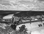 Photo showing the top of the dam with gnarled tree trunk and cactus in the foreground, and the Brazos river extending into the background. The dam, an Ambursen-type reinforced concrete has massive buttress with flat-slab deck, a section of nine roof-weir gates, two bulkhead sections, and an earthen dike. It is 2,740 feet long with a maximum height of 189 feet . It has an elevation of 1,024 feet above mean sea level. The spillway consists of nine roof-weir type gates with top of gate elevation of 1,000 feet above mean sea level.