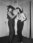 Cowgirl fashions. Miss Emma Marie Arnold seen lighting a cigarette for Miss Kathryn Hatcher. Miss Arnold wears a levi straight pants and vest, with a big flat black hat stitched in contrasting leather; while Miss Hatcher wears a satin shirt with the long, slim pants favored by most ranch girls. Both wear regulation cowboy boots, bright handkerchiefs and Miss Hatcher wears a silver belt buckle on her narrow belt.