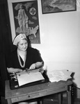 Frances Christopher, a volunteer Red Cross worker, is sitting by her desk and making a Braille transcription. Published on February 9, 1941.