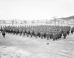First arrivals at Camp Wolters in Mineral Wells, Texas receive drill instructions; pictured is a unit of 181 African-American troops upon arrival to Camp Wolters from Fort Sill in Lawton, Oklahoma. The clipping reads "Eight hours after the first group of selectees arrived Tuesday [March 11, 1941] at Camp Wolters, Mineral Wells, they were receiving drill instruction. The first contingent to reach the infantry replacement center was a unit of 181 negroes. Fourteen hundred white selectees are en route to the camp."
