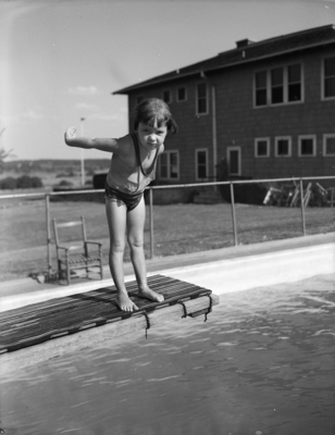 Jane Smith is enjoying the last plunge of summer. The little mermaid is the four year old daughter of Mrs. Emma Smith. Jane is standing on the edge of the diving board, preparing to jump in the Meadowbrook swimming pool. With the help of her three brothers - John, Jake, and Jack, Jane learned how to swim and dive with the best of them.