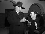 Visitors at the Southwestern Exposition and Fat Stock Show. Tom Simmons, Confederate Veteran, and Mrs. Willie K. Jones, both of Fort Worth, Texas. Tom Simmons is shown handing a box seat ticket to Mrs. Willie K. Jones.