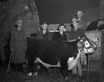 Champion Boys' Club calf at the Southwestern Exposition and Fat Stock Show. "Texas Lad", champion boys' Club calf. Left to right, County Agent H. A. Firzhugh of Bexar County; Doctor Charles H. Harris, Fort Worth, Texas; Frank E. Jones, executive vice president of Globe Laboratories, Fort Worth, Texas (purchaser of the animal), and David Straus, 17, San Antonio, Texas, owner of the year old calf.