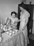 Mrs. V. W. Boswell, left, seated, pouring a cup of tea for her sister-in-law, Mrs. Dave W. Boswell, standing, right. The former entertained with a tea for the latter, who afterwards left with her son, Gary Boswell, for Houston, Texas, to live. Both women are wearing dresses. On the table is a tea set and a tray. Behind the women is a cabinet.