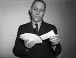 Harry Snyder, 1941 director of the Chamber of Commerce, shown in his suit and tie drawing flash cards.