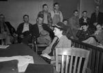 Scenes from murder trial the Olton, Texas of Mrs. Lila Mae Lenck, charged with murder in connection with the slaying of her son-in-law, Leonard G. Thedford at Littlefield, Texas. In the image is Mrs. Norene Allen Clark, a defense witness, who worked for the Thedfords as a maid. She is wearing a coat and a hat and is sitting in the court-room. There are some unidentified crowds in the background.