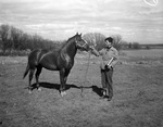 A scene from the Midwest Livestock Show & Exposition, Sweetwater. The photograph shows Leroy Spires of Roscoe with "Red Jacket," a champion quarter horse of the show.